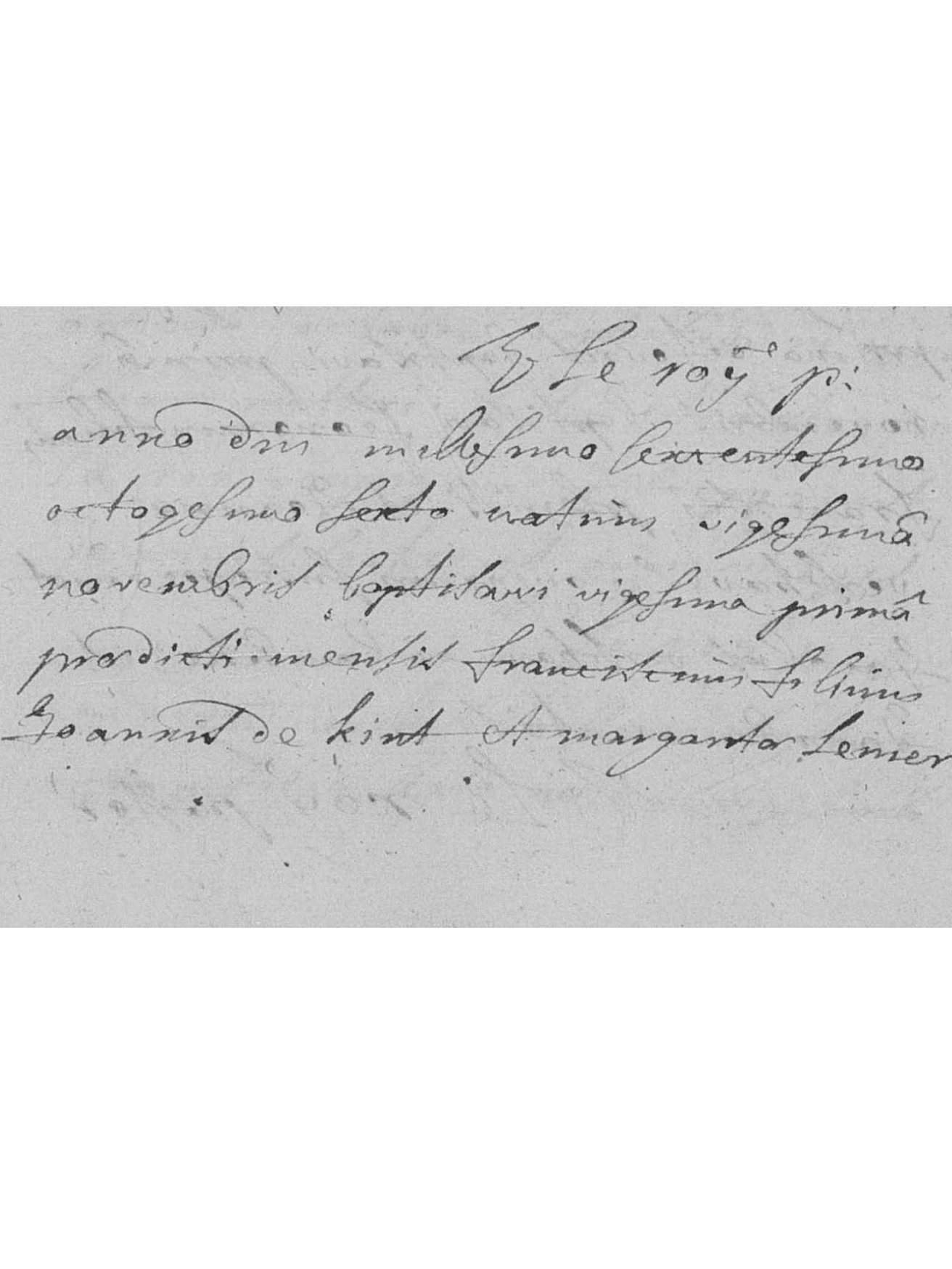 Joannes de KintJoannes de Kint  * 12-03-1656 Oost-Vleteren, België † 19-04-1722 Proven, België ∞ Margarita Liniet, 20-08-1679 Proven, België, 4 kinderen |