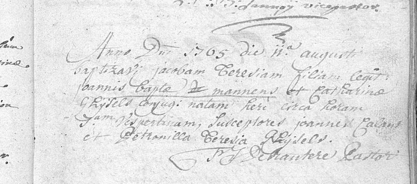 | Moeder | Catharina GijselsCatharina Gijsels ![]() * 13-04-1730 Adegem, Maldegem, België † 13-04-1771 Oostwinkel, Zomergem, België ∞ Johannes Baptiste Mannens, 02-05-1754 Adegem, Maldegem, België, 11 kinderen |