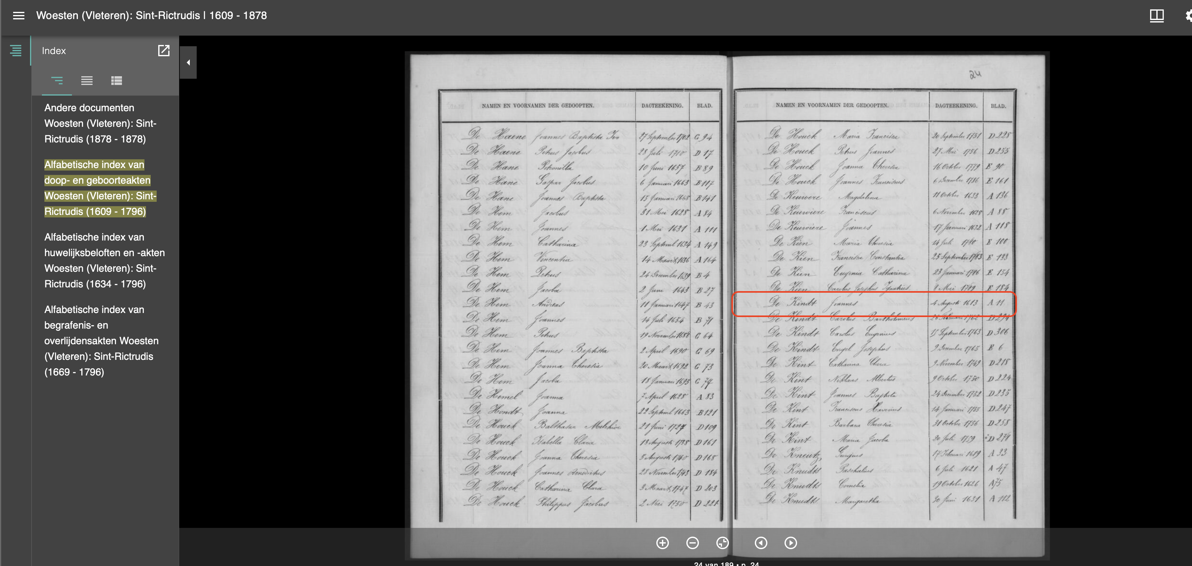 Alfabetische index Doop-en geboorteakten in Parochieregisters St. Rictrudis Woesten 1609-1796, p.24r