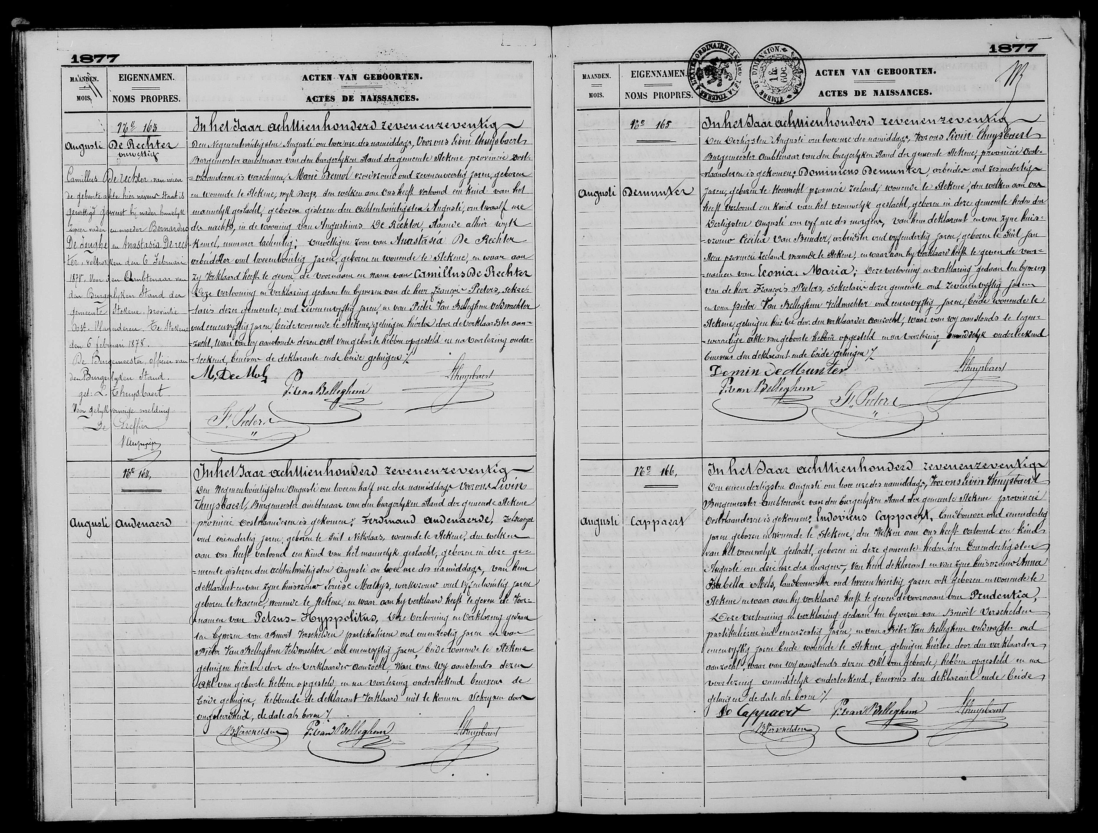 BS Stekene, Geboorten 1877, akte 165. "Belgique, Flandre-Orientale, registres d’état civil, 1541-1950," database with images, FamilySearch (https://familysearch.org/ark:/61903/3:1:33SQ-GP8X-GKG?cc=2138513&wc=Q82R-8FM%3A1009326101%2C1068882401 : 16 May 2016), Stekene > Geboorten 1876-1882, huwelijken 1872-1880, overlijden 1872-1877 > image 126 of 1074; België Staatsarchief (Belgium State Archives), Oost-Vlaanderen. Filmnr. 004832417. |