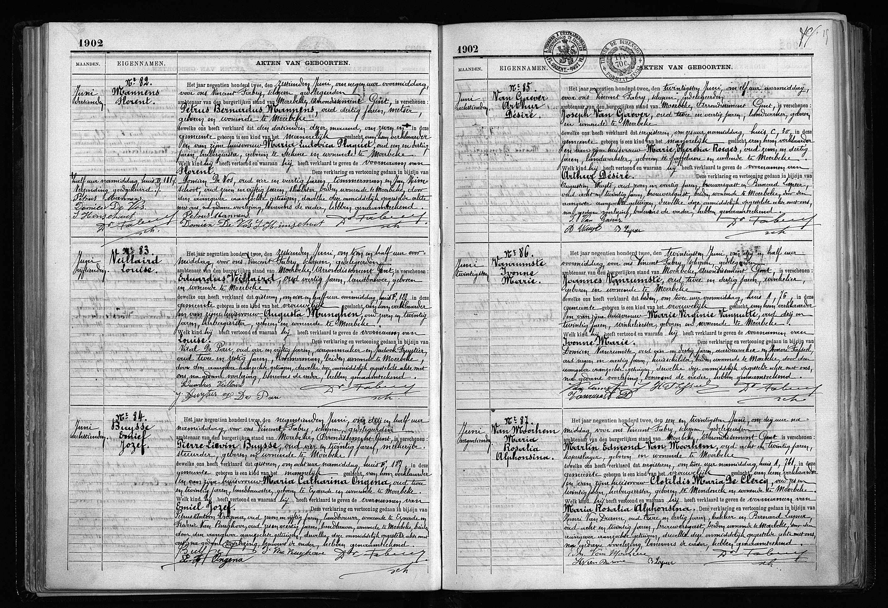 BS Moerbeke, Geb. 1902, akte 82, "Belgique, Flandre-Orientale, registres d’état civil, 1541-1950", , FamilySearch (https://www.familysearch.org/ark:/61903/1:1:QKD7-K17W : Sat Mar 09 20:30:57 UTC 2024), Entry for Florent Mannens and Petrus Bernardus Mannens, 16 Jun 1902. |
