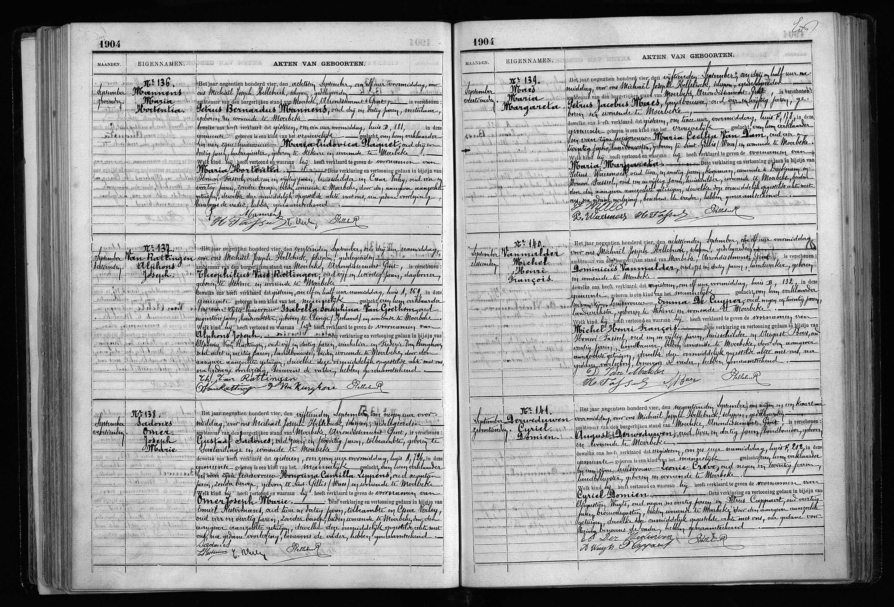 BS Moerbeke, Geb. 1904, akte 136 "Belgique, Flandre-Orientale, registres d’état civil, 1541-1950", , FamilySearch (https://www.familysearch.org/ark:/61903/1:1:QKD7-K2HD : Sun Mar 10 08:37:12 UTC 2024), Entry for Maria Hortentia Mannens and Petrus Bernardus Mannens, 08 Sep 1904. |
