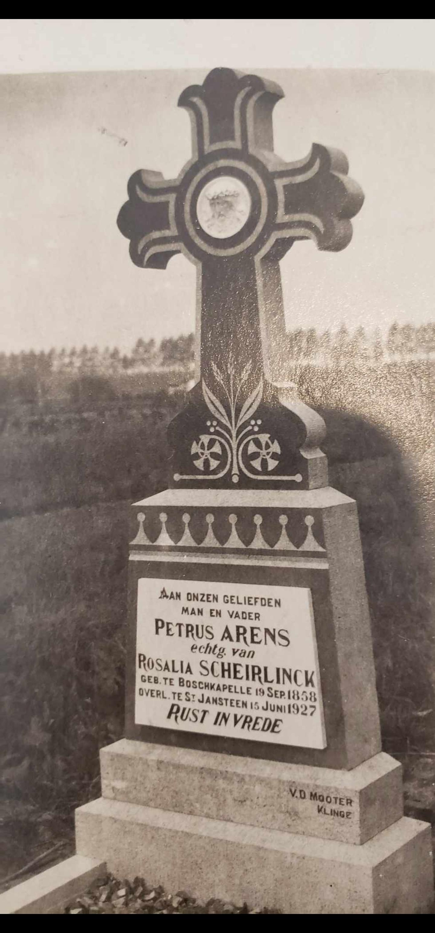 Foto via David Lavallée. Onduidelijk is waar dit graf gesitueerd moet worden. Navraag bij de beheerders van de begraafplaatsen in Sint Jansteen, Stoppeldijk en Boschkapelle leerde dat er geen registratie is in de begrafenisboeken aldaar van Petrus Arens. |